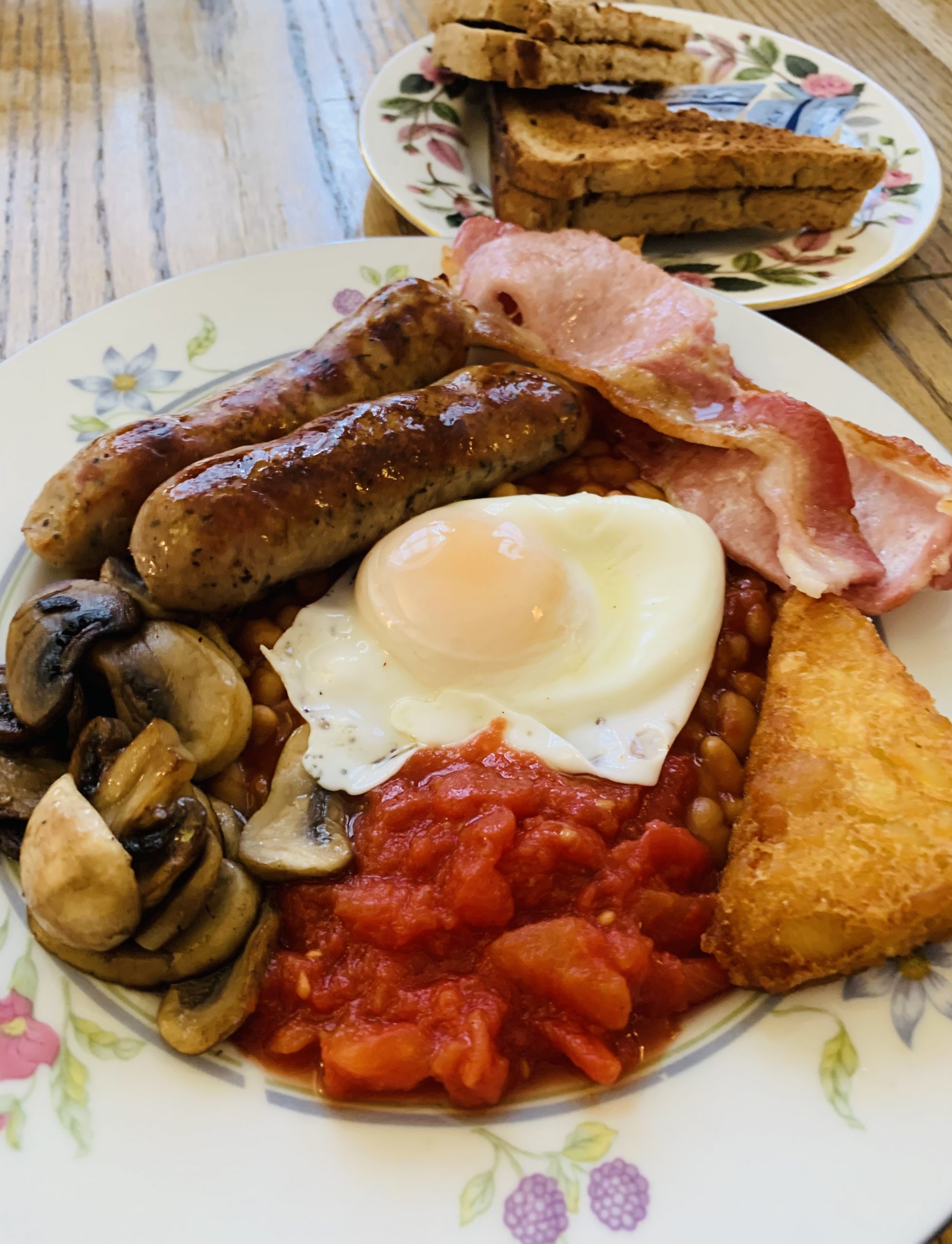 Freshly made and comprising: 2 sausages, 2 bacon, egg, beans, tomato, hash brown, mushrooms and toast.